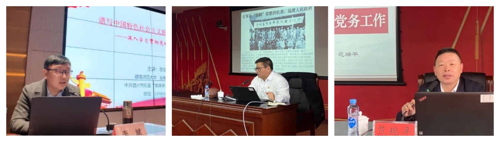 江西瑞金干部学院李斌、胡玉春、范瑞平三位讲师,分别作题为《谱写中国特色社会主义新征程的绚丽华章——深入学习贯彻党的二十大精神》、《中央红军长征与苏区精神》、《如何做好新时代党务工作》的专题讲座,对党的二十大精神、中央苏区的历史、精神内涵及党务工作者业务能力提升,作了深入浅出的讲解和教授。