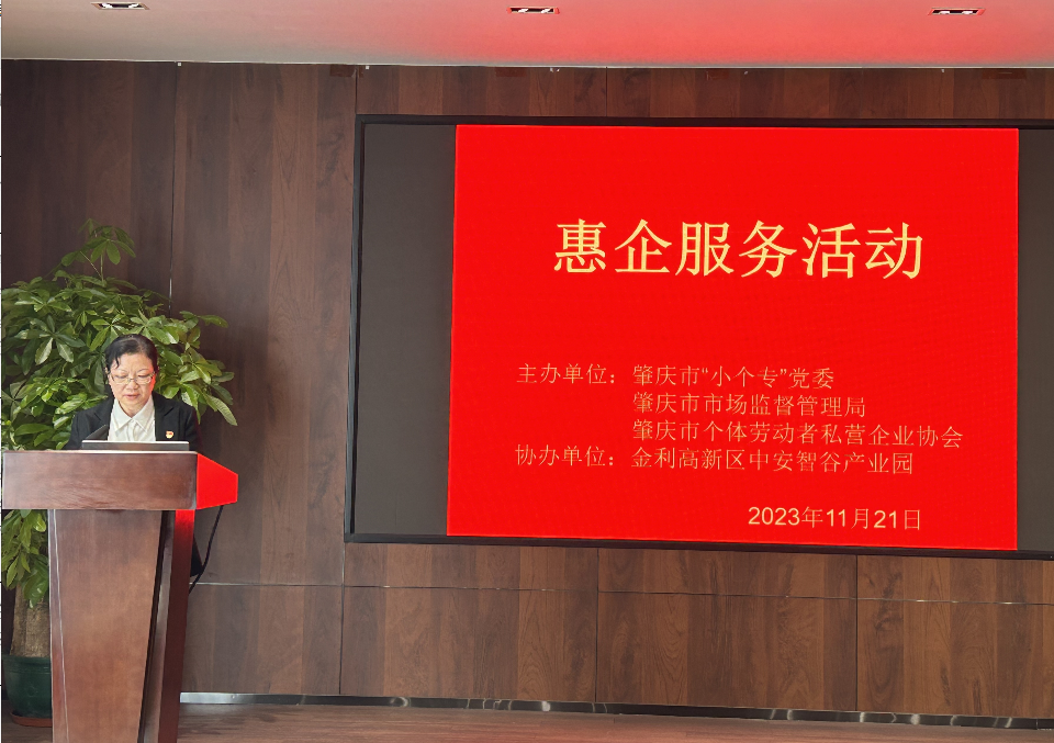为大力开展“为民办实事”活动,近日,肇庆市“小个专”党委、市市场监管局、市个私协会联合到金利高新区开展惠企服务活动。活动由市市场监管局党组成员、市“小个专”党委专职副书记叶肖媚主持,高要区市场监管局分管负责同志以及金利高新区个私企业代表共30多人参加活动。