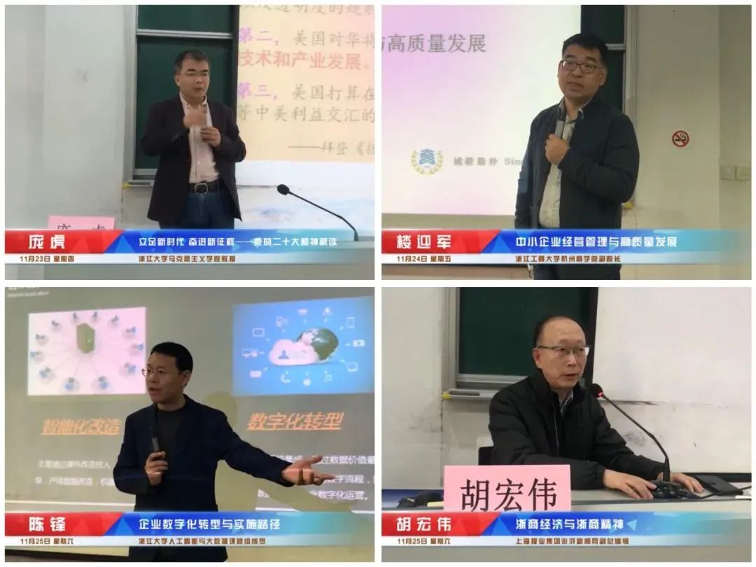 培训以理论学习和现场教学相结合的形式,采取讲授教学、体验教学、研讨教学、现场教学等多种教学方式进行。培训课邀请浙江大学名家教授为学员授课,通过系统学习党的二十大精神解读、企业党建引领、中小企业经营管理与高质量发展、企业数字化转型与实施路径等,教授们因势利导、循序善诱,为学员们带来一场精彩知识的盛宴,为大家的理论提质增效。