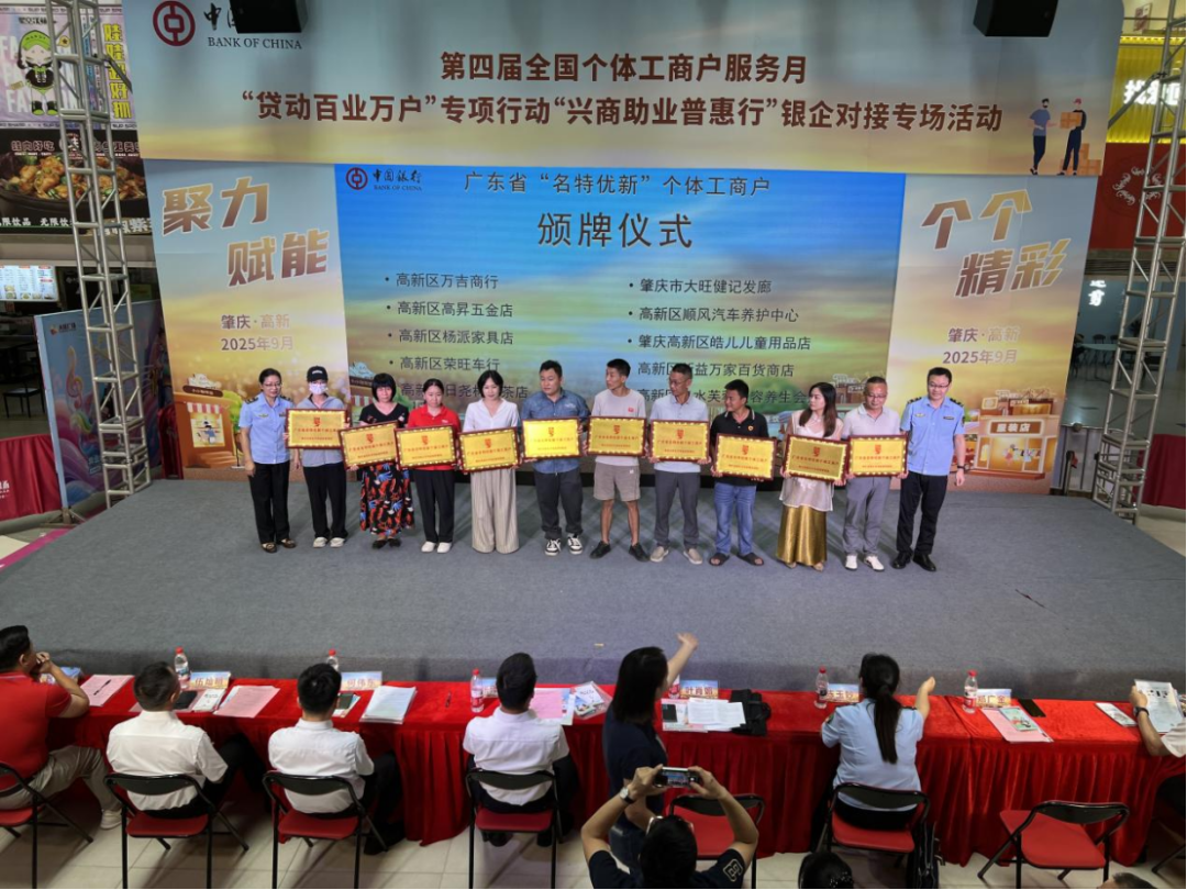 中国银行肇庆分行为个体工商户量身定制“个体工商户专属金融服务方案”,推出“兴商贷”等特色金融产品,现场向三家合作商户授予专属授信额度。银行工作人员提供“一对一”金融对接服务,为参会商户量身定制综合融资服务方案,现场交流踊跃、气氛热烈。