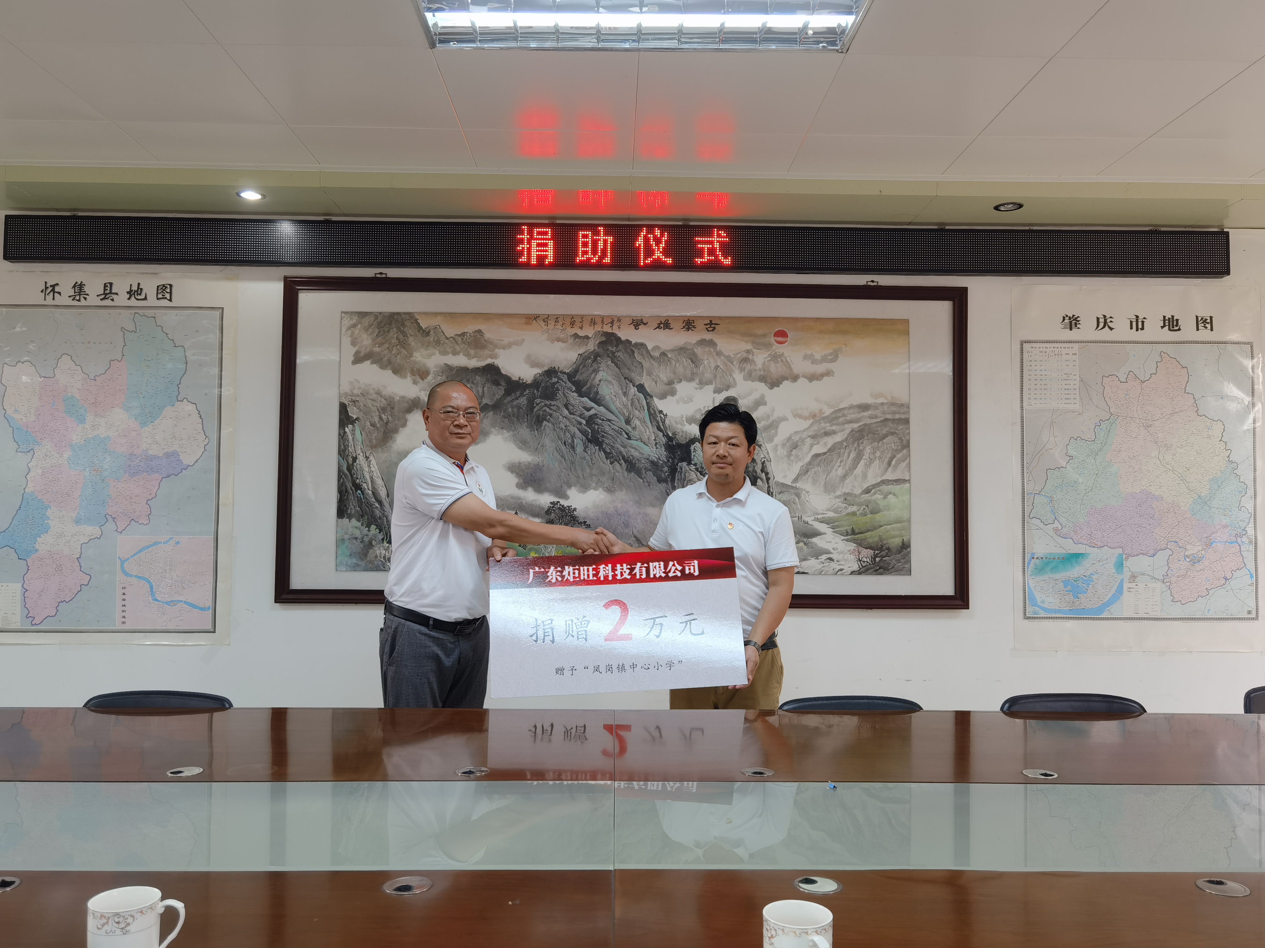 会后,会长官富财先生以广东炬旺科技有限公司名义现场捐资贰万元,资助凤岗镇中心小学的学校建设,校长陈怀志为表感谢,亲自将一面写有“关爱教育事业,彰显企业情怀”的锦旗送到官富财手中,并表示学校改建后的成效照片一定发送给他看。