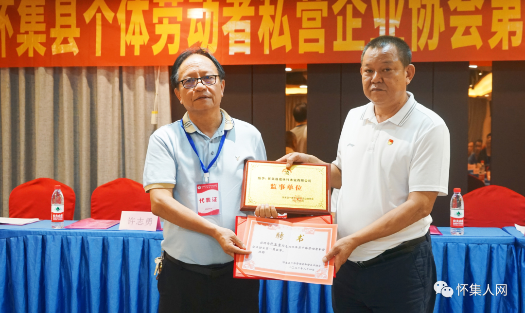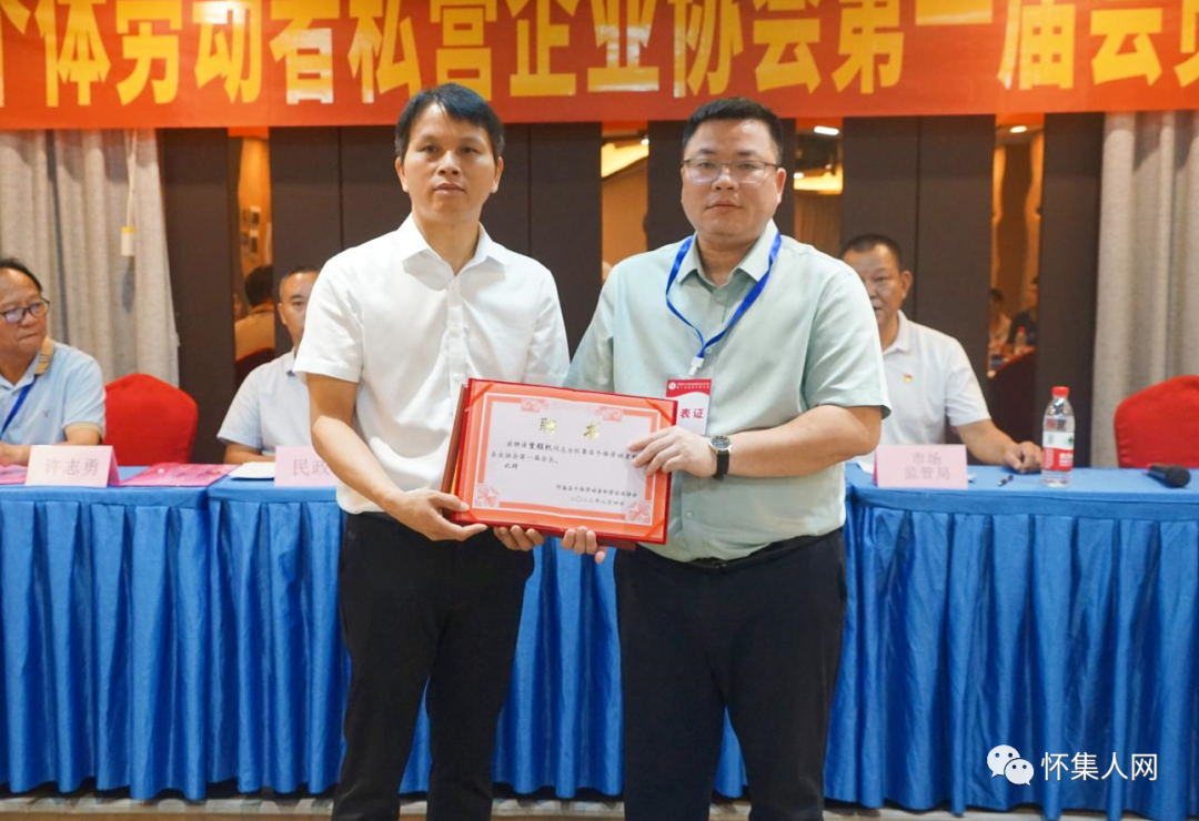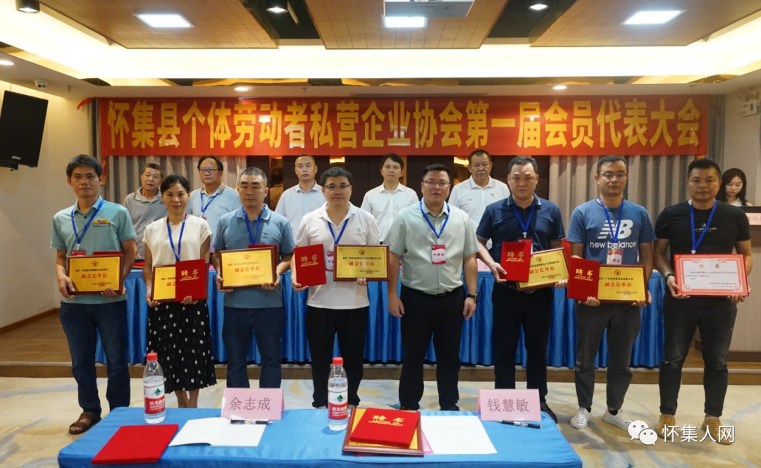 怀集县个体劳动者私营企业协会第一届理事会成员、监事获颁牌匾和聘书。