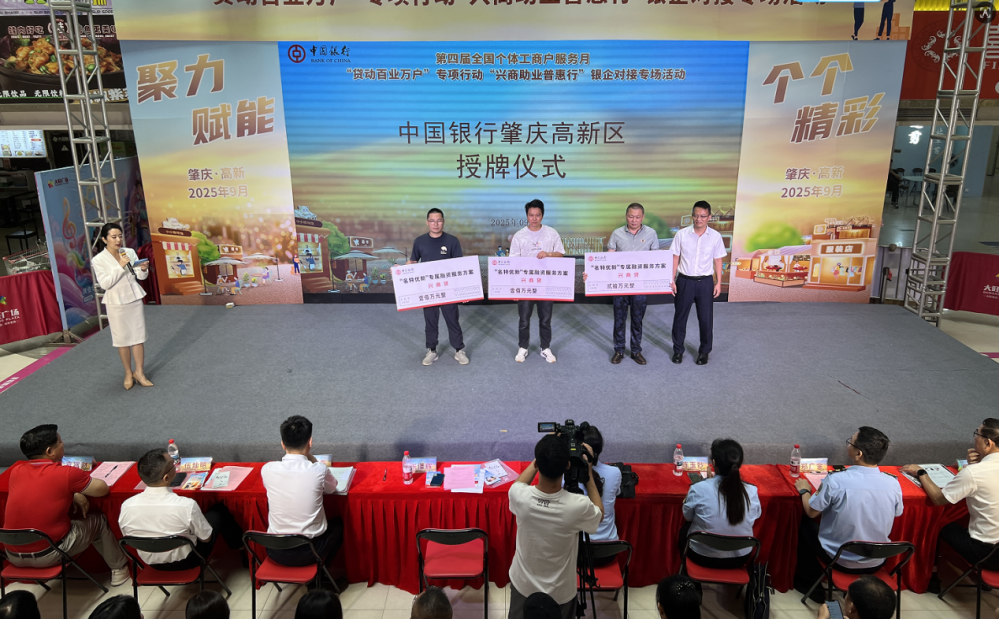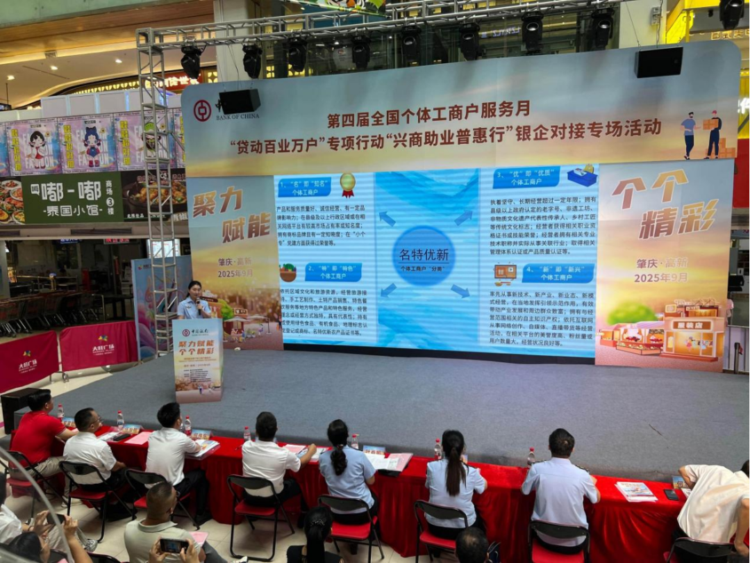 中国银行肇庆分行为个体工商户量身定制“个体工商户专属金融服务方案”,推出“兴商贷”等特色金融产品,现场向三家合作商户授予专属授信额度。银行工作人员提供“一对一”金融对接服务,为参会商户量身定制综合融资服务方案,现场交流踊跃、气氛热烈。